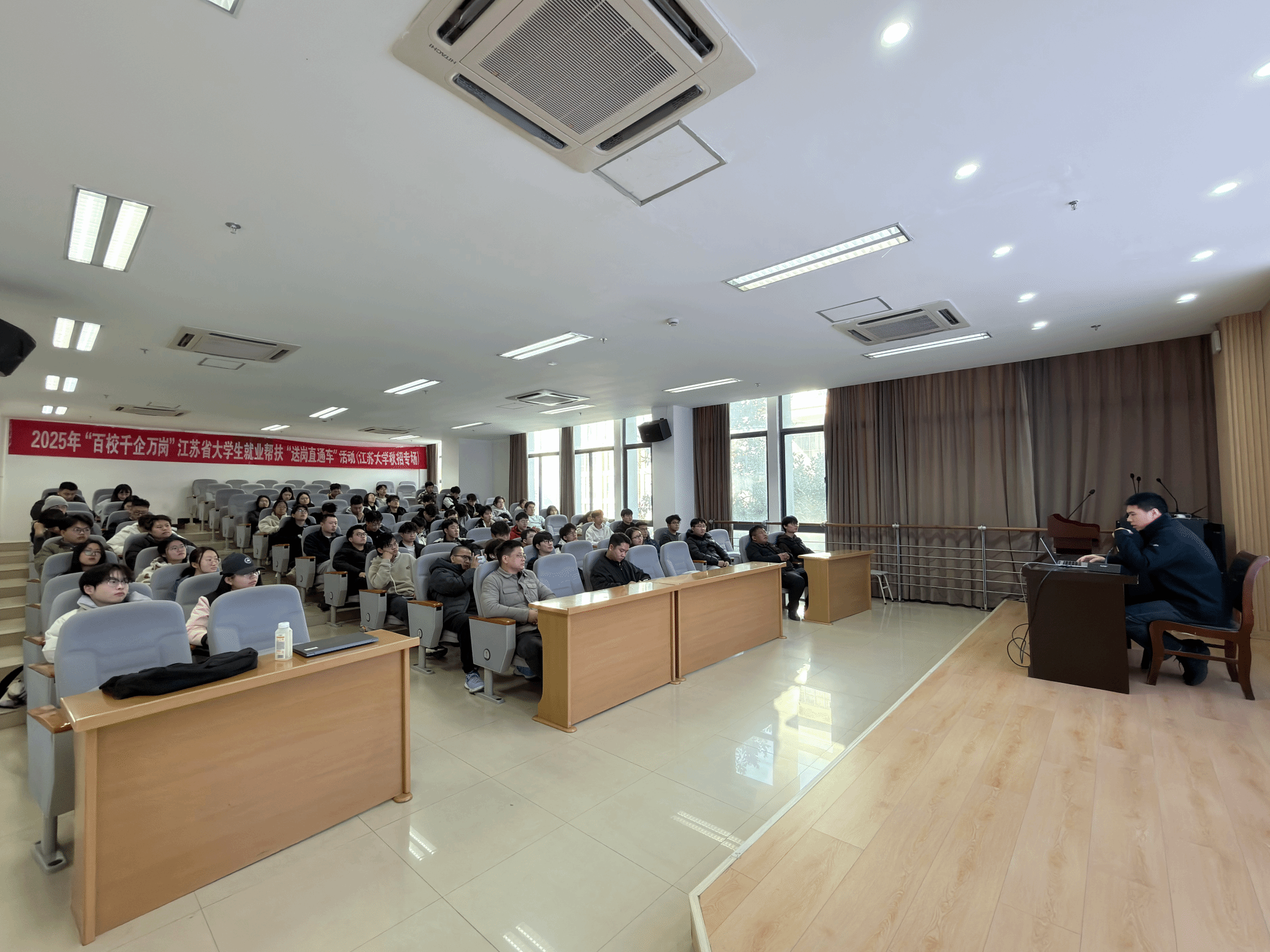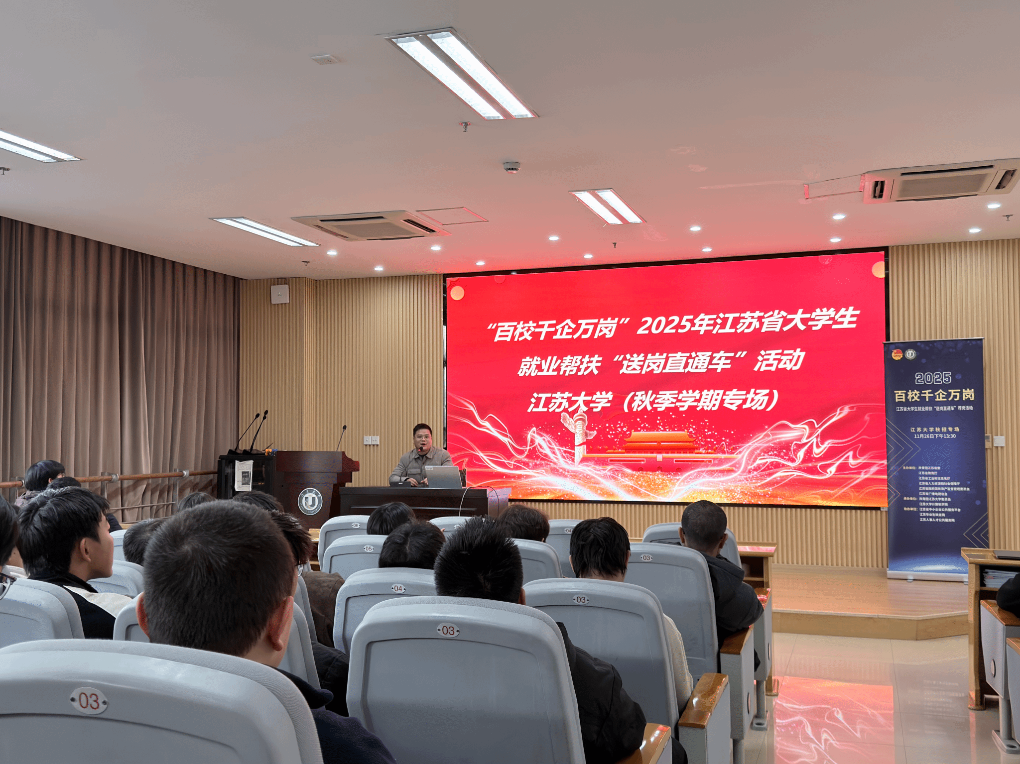 为扎实推进“共青团促进大学生就业行动”,进一步提升大学生就业服务质效,11月26日下午,“百校千企万岗”2025年江苏省大学生就业帮扶“送岗直通车”活动江苏大学(秋季学期专场第四场)于计算机学院208报告厅成功举办。本次活动由共青团江苏省委、江苏省教育厅、江苏省工业和信息化厅、江苏省人力资源和社会保障厅、江苏省人民政府国有资产监督管理委员会、江苏省广播电视总台主办,共青团江苏大学委员会、江苏大学计算机学院承办。