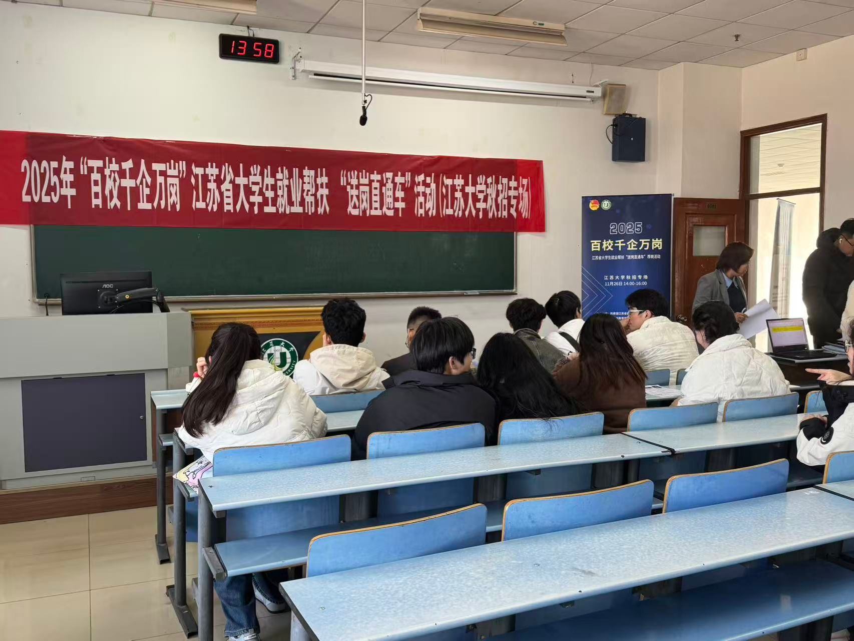 为深入推进“共青团促进大学生就业行动”,进一步提升大学生就业服务质效,11月26日下午,“百校千企万岗”2025年江苏省大学生就业帮扶“送岗直通车”活动江苏大学(秋季学期专场第六场)于三江楼702圆满收官。本次活动由共青团江苏省委、江苏省教育厅、江苏省工业和信息化厅、江苏省人力资源和社会保障厅、江苏省人民政府国有资产监督管理委员会、江苏省广播电视总台主办,共青团江苏大学委员会、江苏大学财经学院承办。