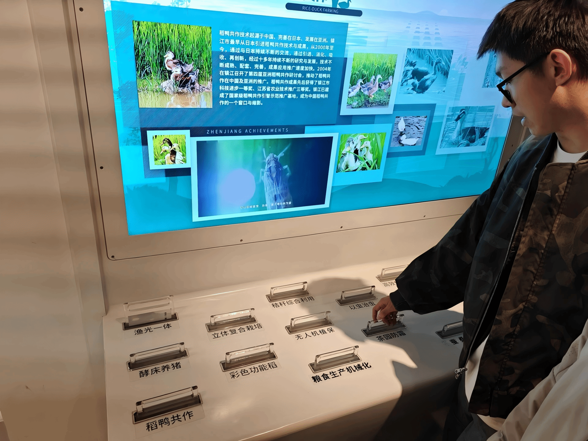 活动中,巨型昆虫互动展项率先吸引同学们目光,按下触控按钮即可观看昆虫身体结构动态拆解,让生物知识直观呈现;航空展区内,大家转动操作杆观察气流在机翼周围的流动轨迹,轻松理解飞机飞行的气压差原理。生态展区里,同学们在“稻鸭共作”互动屏前,直观了解鸭群除虫促稻生长的生态农业模式,感受生态循环的魅力。生命科学展区成为热门打卡地,人体生理模型搭配触控动画,清晰解读抽象的生理系统运作;“透视生命数字”互动屏可同步呈现人体骨骼运动轨迹,趣味展现人体结构的精密性;简单有趣的“钉板人体印”展项,也让同学们直观感知人体形状特点。