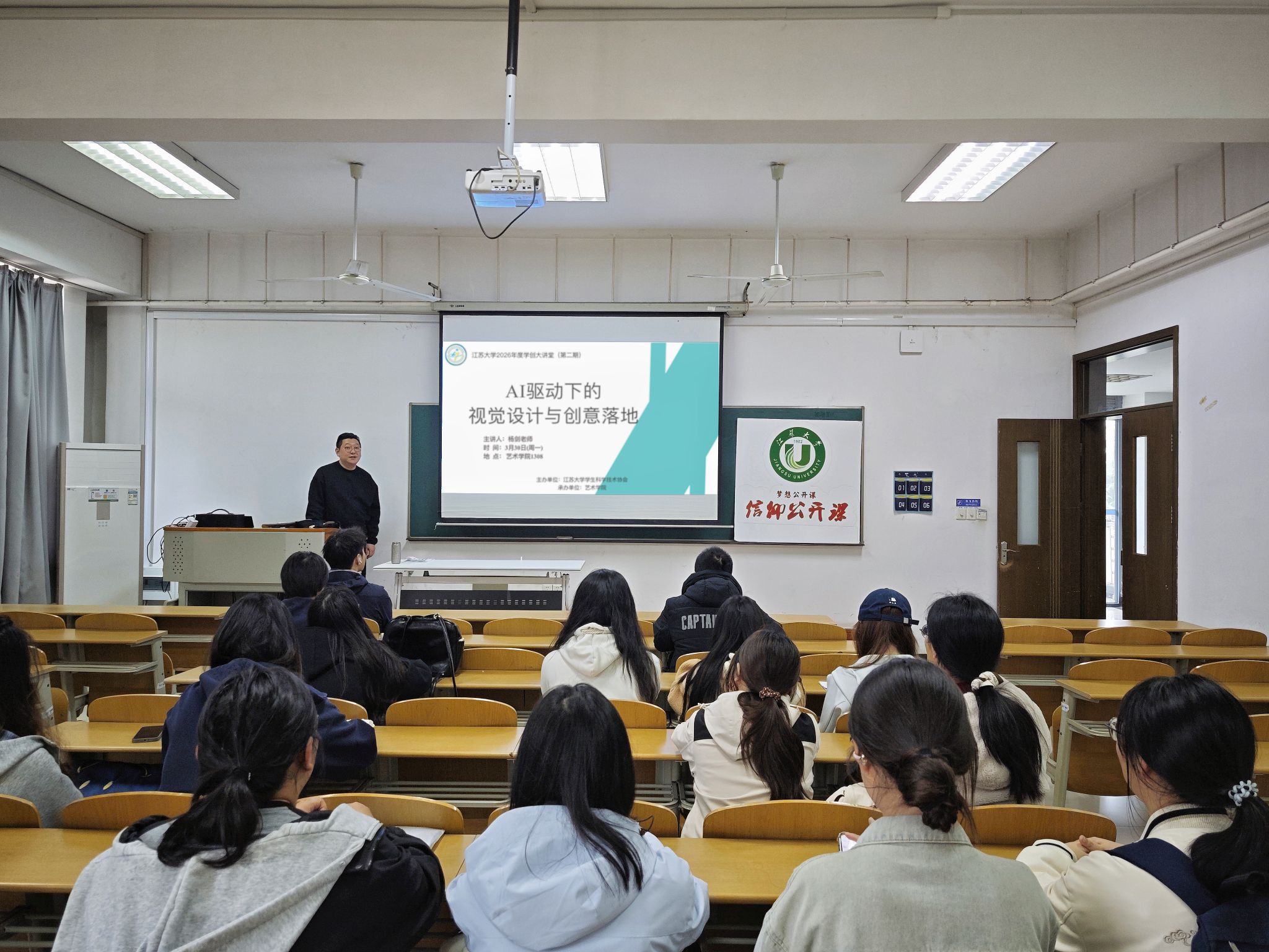 2026年3月30日,江苏大学学生科学技术协会与艺术学院学生科学技术协会在艺术学院1308室共同举办学创大讲堂。本次活动由艺术学院杨剑老师主讲,主题为AI驱动下的视觉设计与创意落地。