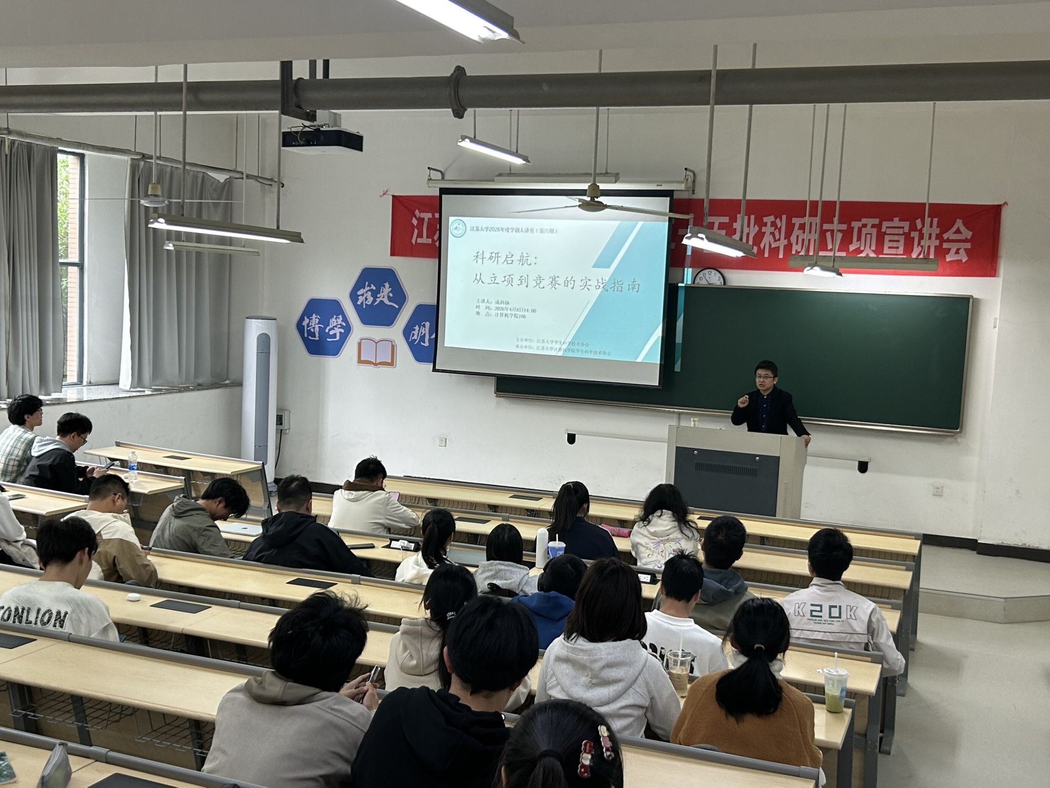 4月8日,江苏大学学生科学技术协会联合计算机学院学生科协,在计算机学院106教室成功举办2026年度第四期学创大讲堂。本次活动由计算机学院成科扬老师主讲,主题为《科研起航:从立项到竞赛的实战指南》,吸引全院百余名学生到场参与。